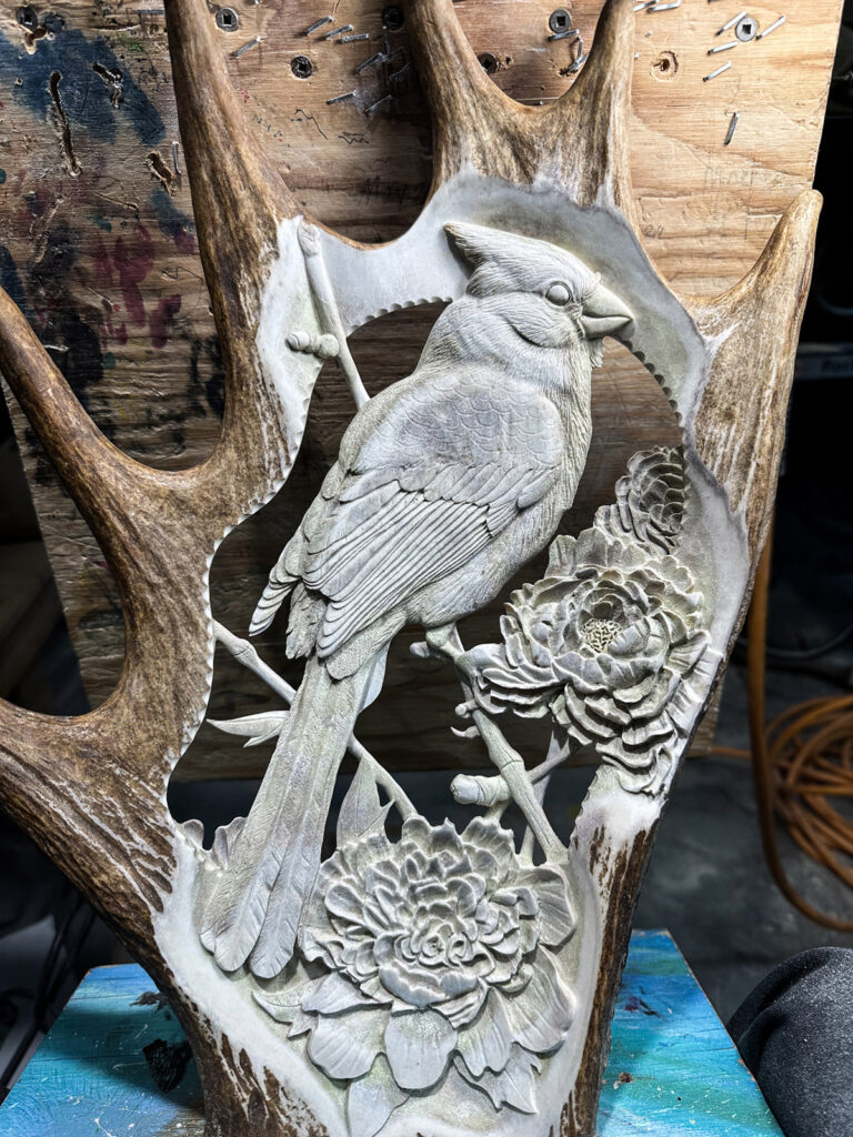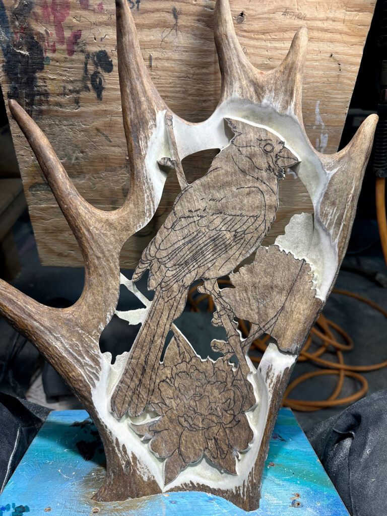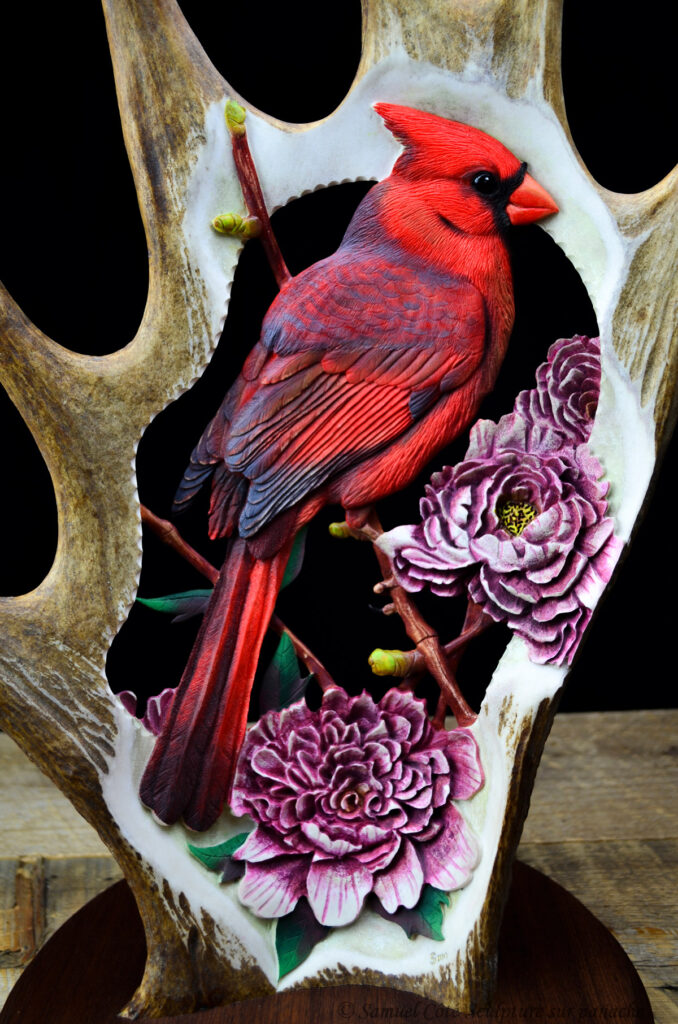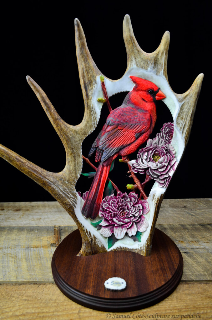 Ce que j’aime de mon métier, c’est la possibilité de créer pratiquement n’importe quoi à partir d’une matière noble: un panache. Ceci étant dit, j’aime varier les sujets dans la création de mes pièces et celle que je vous présente aujourd’hui, tout particulièrement, est vraiment un coup de cœur pour moi. J’aime beaucoup sculpter des cervidés, mais cette fois j’ai ajouté une corde à mon arc avec la création de cette sculpture pour un client. J’ai donc décidé de m’attaquer à ce projet avec un oiseau qui me fascine: Le cardinal.